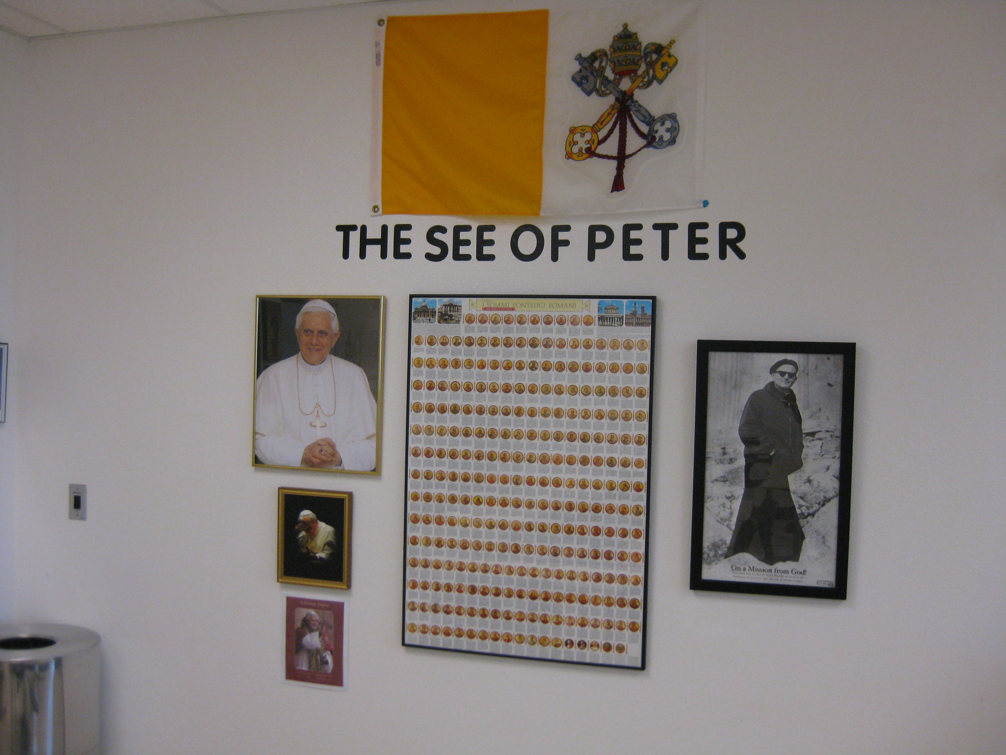 When I first started teaching here in Phoenix about 9 years ago, I was setting up my classroom with many images of the saints, statues, and theological posters, but the one thing that I had to have was a Papal Flag. As I pinned it to the wall in my classroom, one of my colleagues came in my room, looked at the Papal Flag, shrugged his shoulders in a bit of disgust, and then proceeded to ask me – “Are you a Papist?” With a straight face, I replied, “Damn right!” As I reflect on my answer now, was it filled with a little bit of Pride, yes, but you didn’t see his face that day (he didn’t like my picture of St. Francis of Assisi in ecastasy either). You would have thought I pinned up a Nazi flag. The picture below is what the classroom wall with the Papal Flag evolved into after multiple years in the classroom.