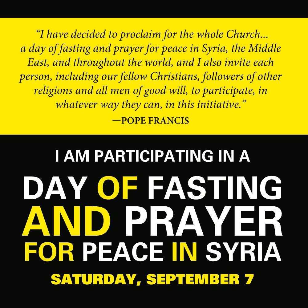See Dr. Taylor Marshall’s post on Fasting for today – http://taylormarshall.com/2013/09/syria-saturday-fasting-ideas.html?utm_source=feedburner&utm_medium=feed&utm_campaign=Feed%3A+taylormarshall+(Dr.+Taylor+Marshall+%7C+Canterbury+Tales)
