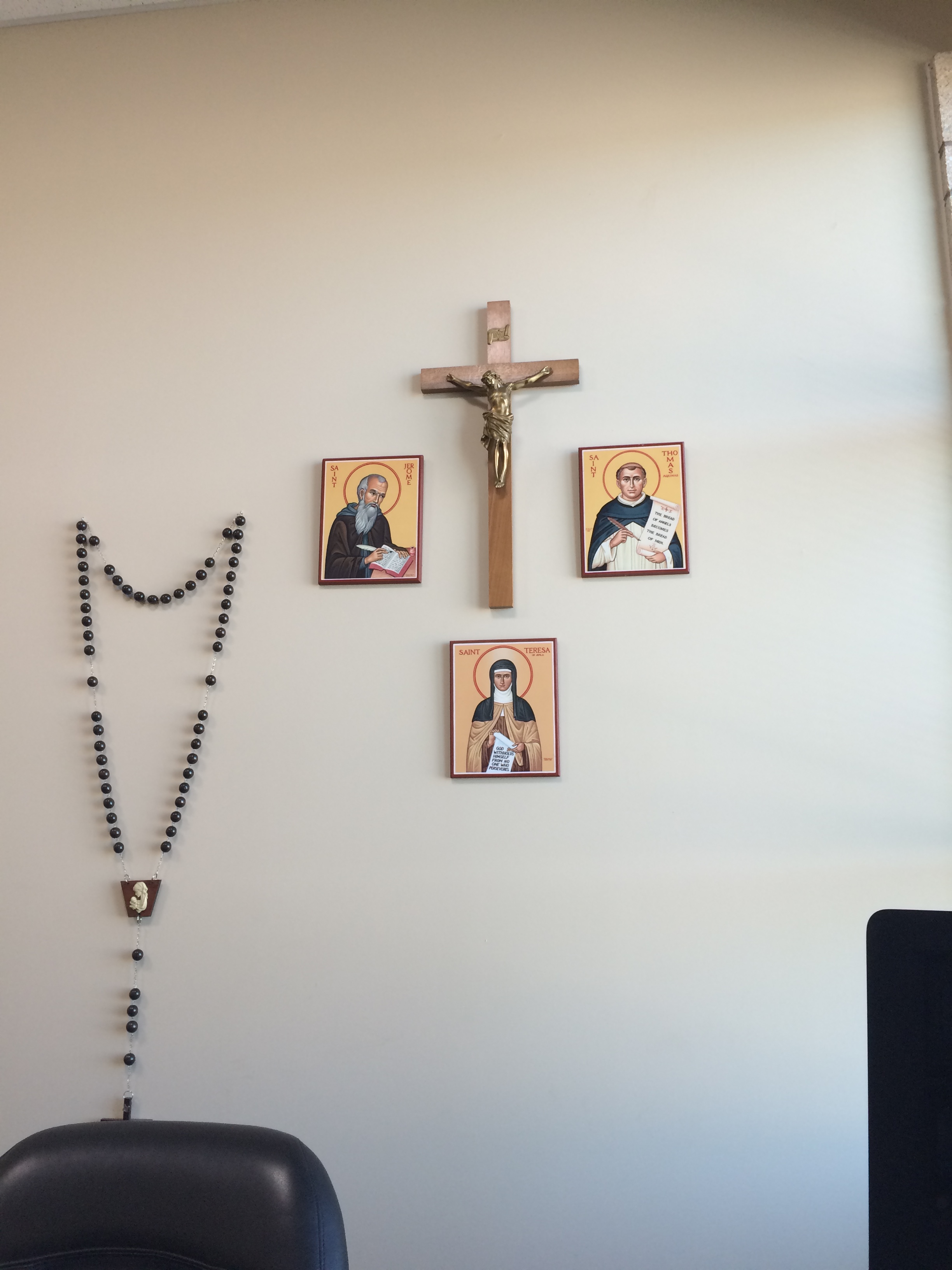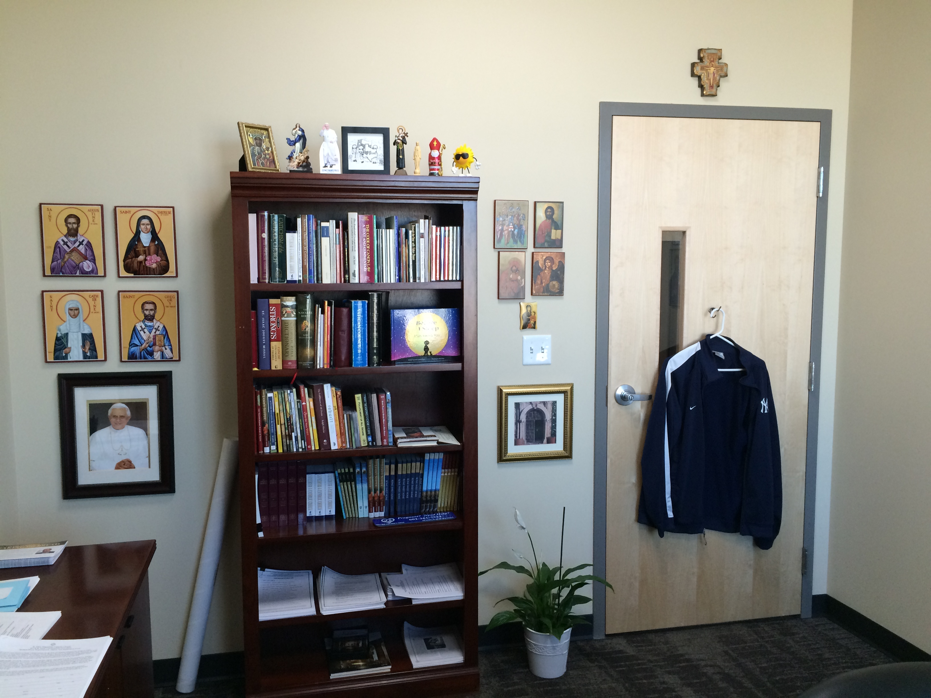 Although my office is essentially where I want it to be, the one thing I will continue to add are statues of the saints and icons. Below you will see where the statues and icons are in my office. They are a great reminder to me what it is to strive for holiness. A reminder I need everyday!