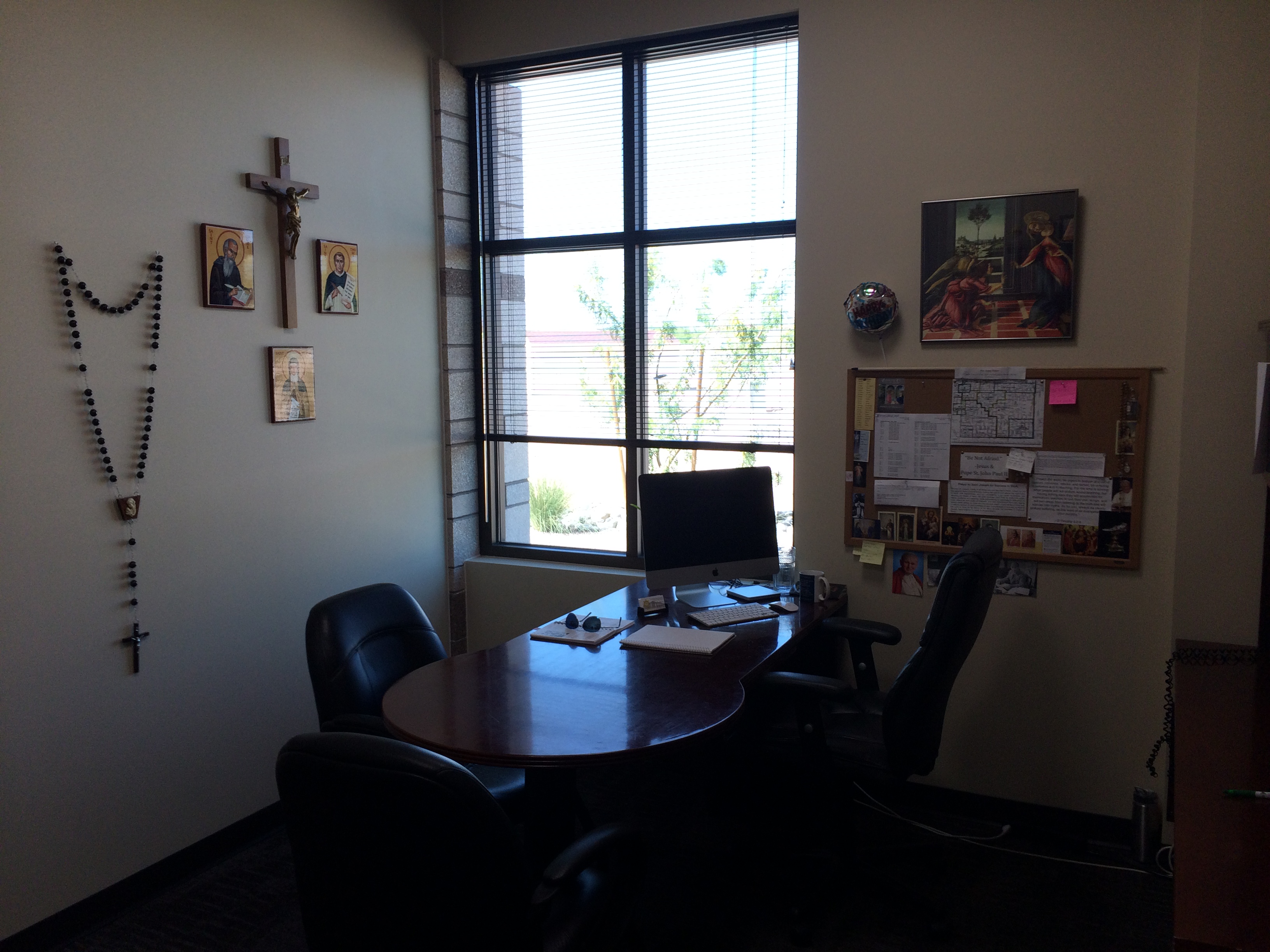 As I promised way back on February 27, 2014, in my blog post, My Catholic Corner Office, at some point when we were in the new parish office building, I would post pictures of my office. At the time of the above blog post, I was sharing an office with one of my co-workers because we didn’t have the space to have our own offices. Now in the new building, which also holds the St. Michael the Archangel Adoration Chapel, we each have our own office. Our supportive staff uses cubicles and many have really made those their own space as well.