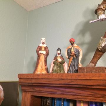 The Magi start on the top of my bookcase after talking with Pope Benedict and the Knight.