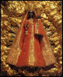 The Mother and child faces were first painted, but have since darkened due to the smoke from the votive candles below it, making it silvery black. It’s been black for many years. For festive occasions, the Benedictine monks dress up the statue. There is a replica of this statue in the abbey church at Prince of Peace Abbey in Oceanside, California.