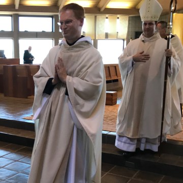 Newly ordained Fr. Bede with Bishop Steven J. Lopes behind him.