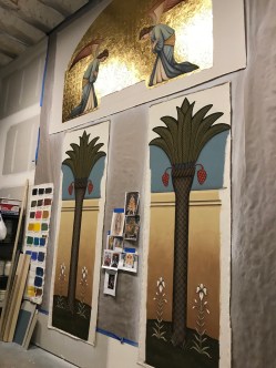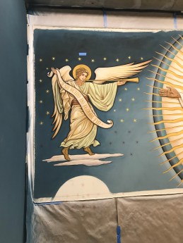 As you will see from the pictures that are interspersed through this post, the sacred art is large, meant to cover walls and ceilings – and is absolutely stunning! Like sacred music, sacred art has the tendency to raise our eyes, minds, and souls towards Heaven itself. These images that Ruth has created do that for me and I imagine anyone that comes into contact with them.