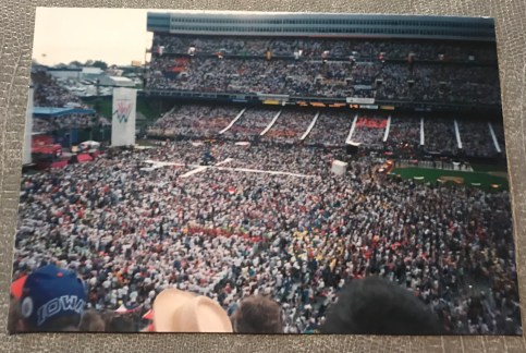 Although I don’t remember the trip up to Denver, I do remember vividly the first time we saw Pope St. John Paul II. We were sitting in Mile High Stadium in the upper deck (see the picture of the ticket below that I still possess) – the experience has been stamped in my mind for all time.