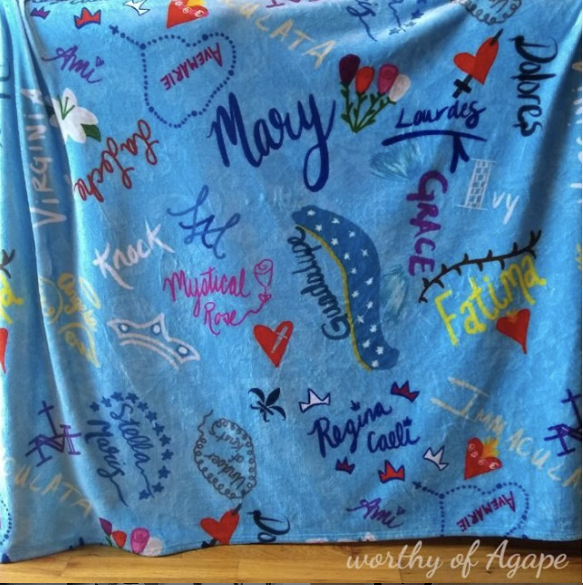 This morning I was scrolling through my Instagram feed and came upon a very cool blanket from the Worthy of Agape shop. The blanket has many names, titles, and symbols that pertain to Our Lady. It is simply called the Names of Our Lady Blanket. For a guy who writes about the Blessed Mother and loves Mama Mary a lot, I found the blanket to pretty awesome and can see myself with one soon.