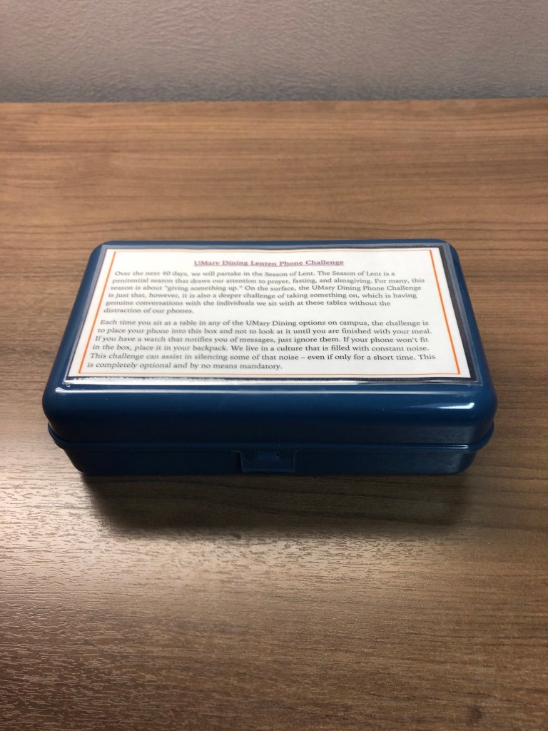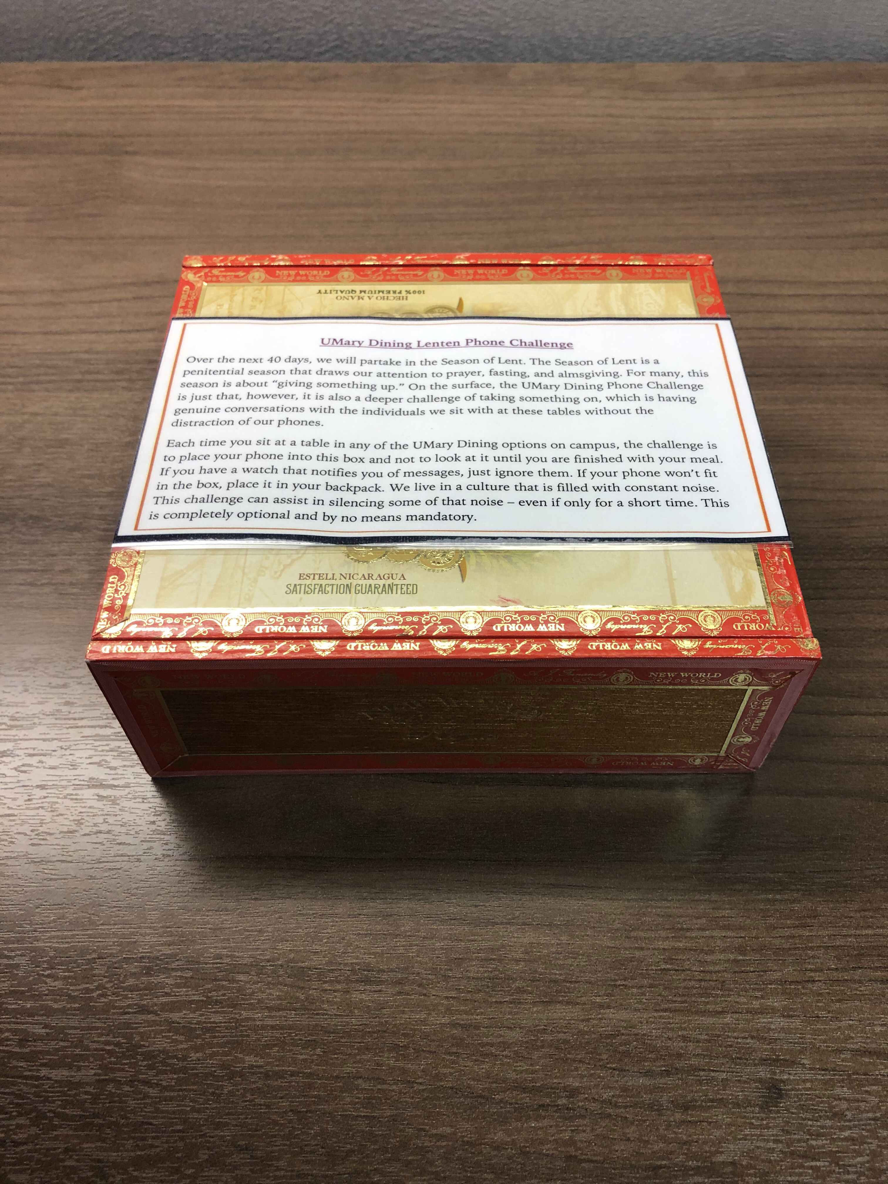 At the time, it seemed rather rudimentary but after working at the University for the past year, fourteen months to be exact, and learning about the Benedictine mission and values of UMary, the phone box idea will premiere today as the UMary Dining Lenten Phone Challenge.  With support from my supervisors and support from colleagues, I am happy to say that this idea has become a reality. The reason why I thought of this idea is that so many people, myself included, are attached to our phones. Although at times they are a useful tool, they can also be an incredible distraction and allow us to waste valuable time. They also tend to rule our lives even when we are spending time with other people.