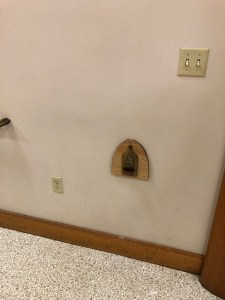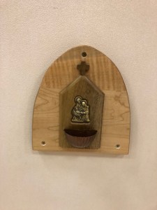 As you will see below from the pictures I took with my phone, they are at a height where many children can reach them. My 2 ½ year immediately recognized it and knew what it was – he blessed himself and was very excited, although we are still working on which hand to use and the making the Sign of the Cross correctly (he does know all of the words).