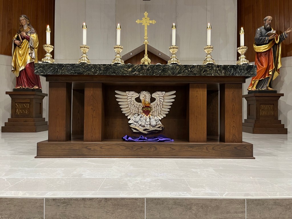 As it is with our parish, the pelican has been an element within the liturgy of the Catholic Church, especially on the front of high altars. During the persecution of the Catholic Church in England during the reign of Henry VIII, monasteries began creating tabernacles in the shape of a pelican and suspending them in the air above the sanctuary to keep the Eucharist safe from desecration.